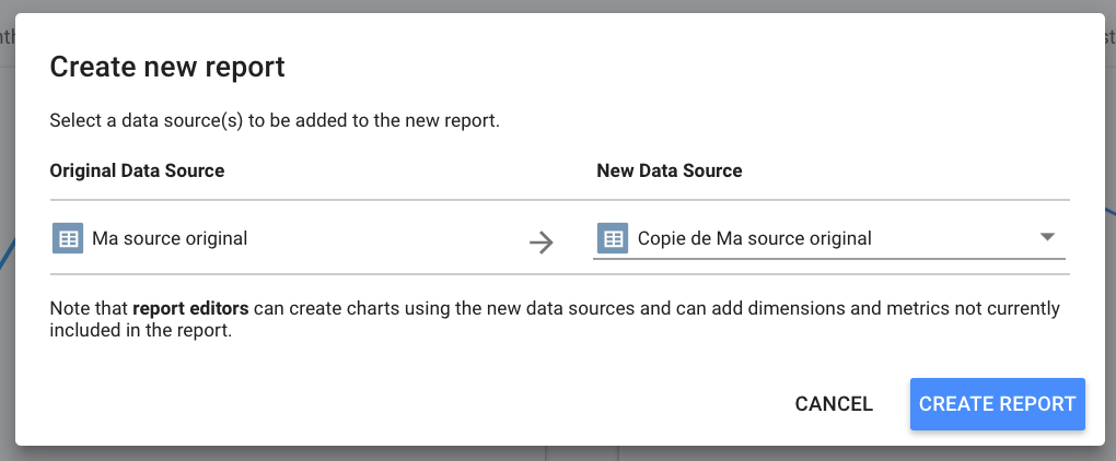 - Enfin, dupliquer le tableau de bord lui-même. Ouvrir le tableau de bord, cliqué ‘Make a copy of this report’. Google Data Studio vous demandera alors d’associer la copie du rapport que vous êtes en train de créee à une nouvelle source. Il faut alors sélectionner la copie de la source créée lors de l’étape précédente.