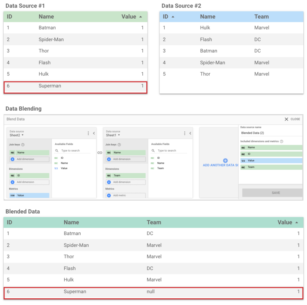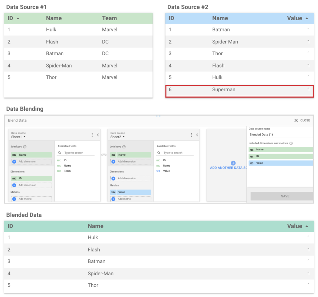 The first thing to known when blending data is that only rows with a key from the primary data source matching a key from the second data source are passed into the blended data. In the example below, you can see that Superman doesn’t appear in the blended data because he is not listed in the first data source. The direct consequence of this is that the order of data source when blending them is crucial.