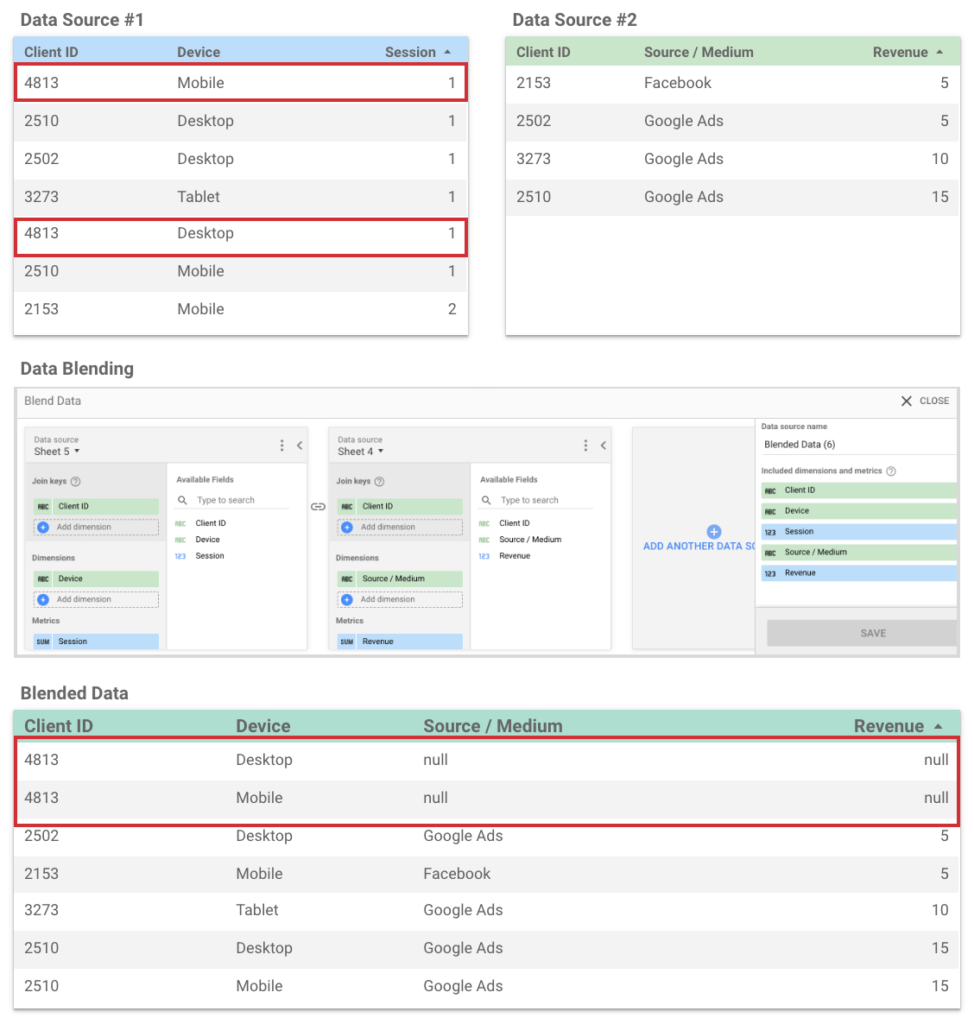 We know that only rows with a key from the primary data source matching a key from the second data source are being passed to the blended data. Looking at the example below, you can see that the first data source contain the client ID 4813, which is not in the second data source. Consequently, rows from client ID 4813 are passed in the blended data with _null_ values for the columns of the second data source (“Source / Medium” and “Revenue”).