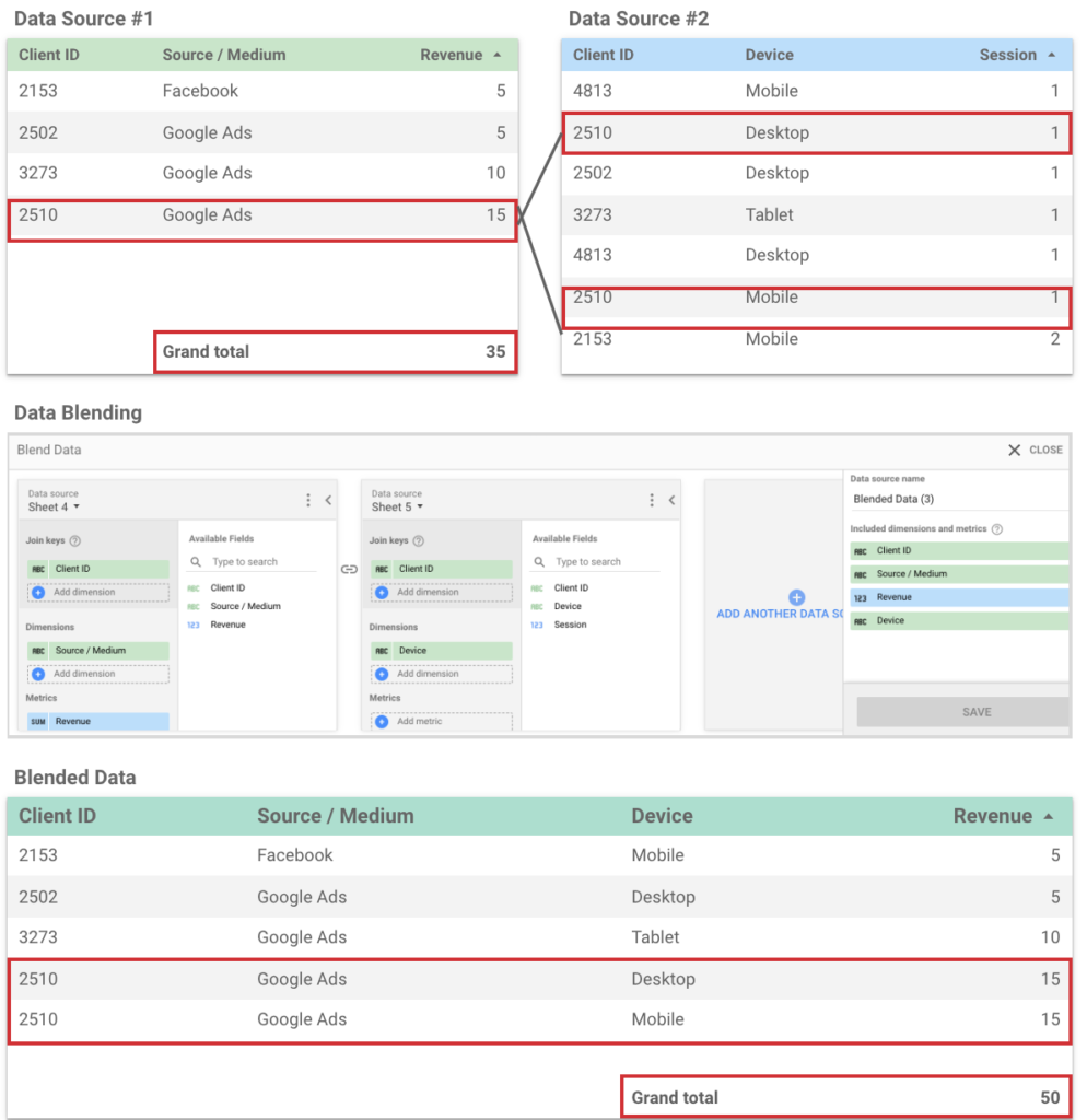 Blending data can generate duplicated rows and biased your calculation. Looking at the data set below, we can see that client ID 2510 have two sessions (mobile and desktop) for only one purchase. When blending the data sources, the unique row for the client ID 2510 is duplicated in two rows (one row for each session of the second data source). One-time purchase of Client ID 2510 appears now in two different rows. Blended data total revenue is 50 when it should be 35!